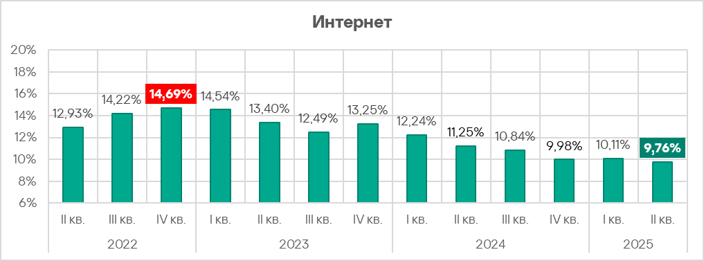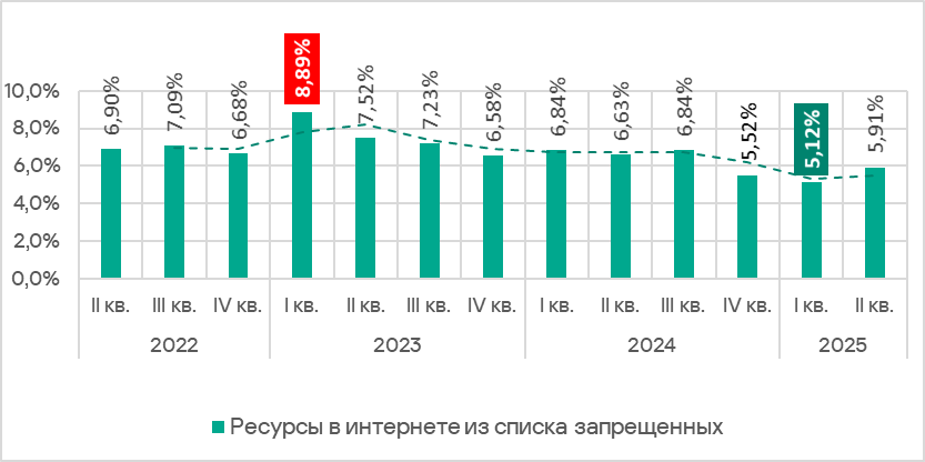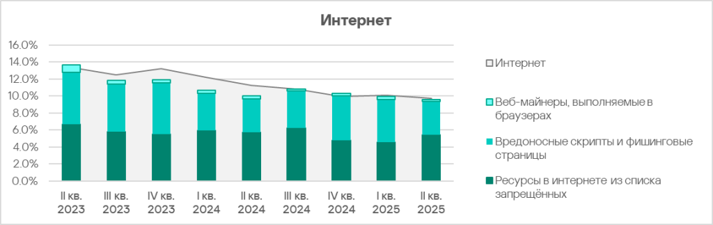 Во втором квартале 2025 года доля компьютеров АСУ, на которых были заблокированы угрозы из интернета, уменьшилась до 9,76% — это минимальный показатель в период со второго квартала 2022 года.