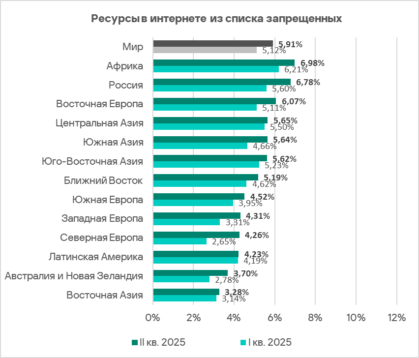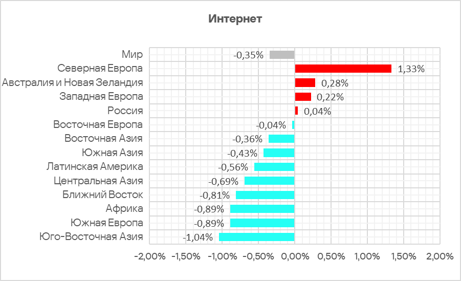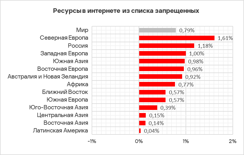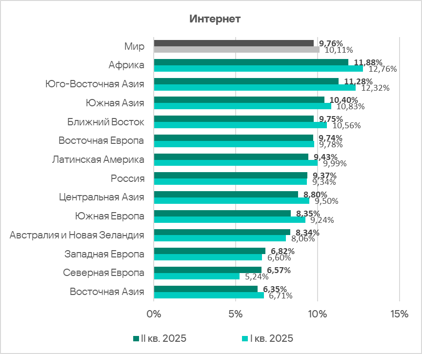 В регионах доля компьютеров АСУ, на которых были заблокированы угрозы из интернета, варьирует от 6,35% в Восточной Азии до 11,88% в Африке.