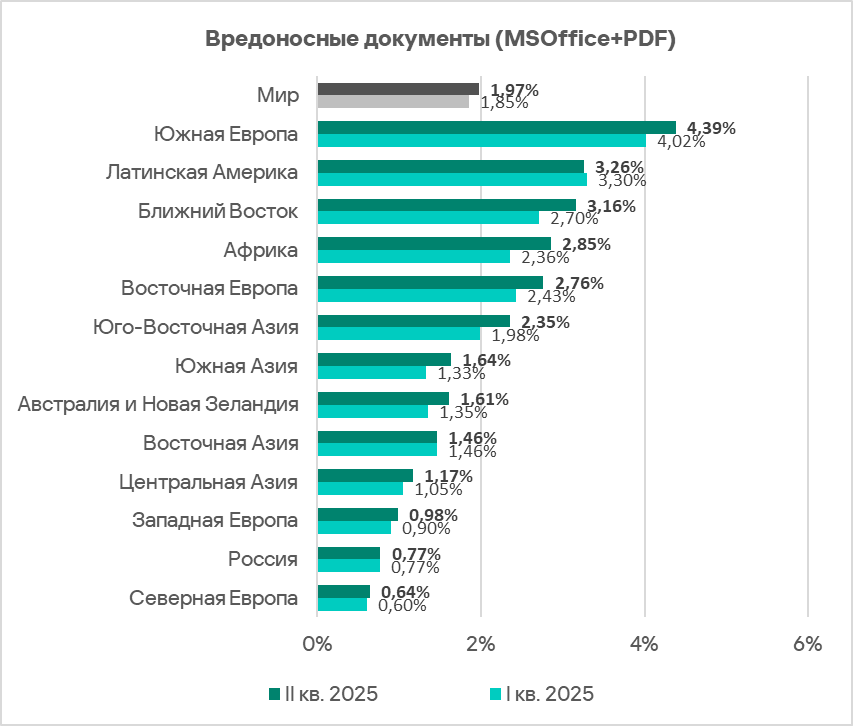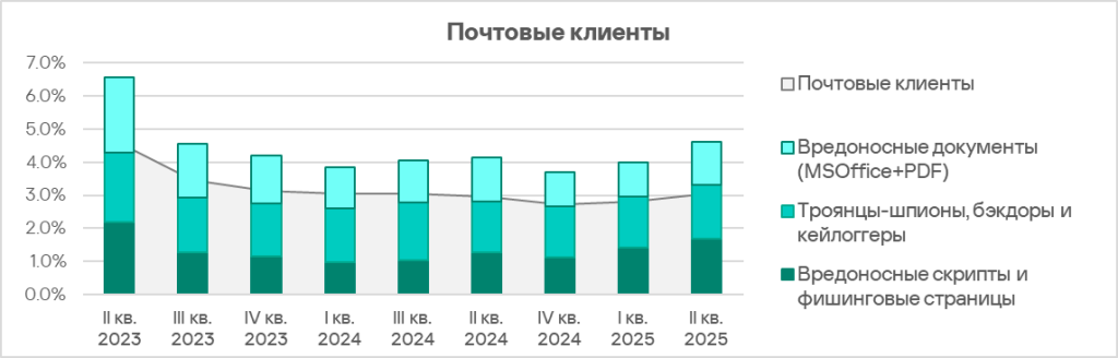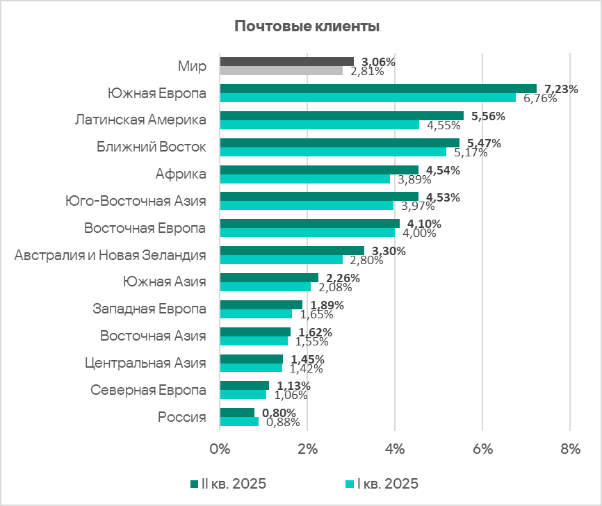Во втором квартале 2025 показатель угроз из почтовых клиентов увеличился во всех регионах, кроме России, больше всего — в Латинской Америке.