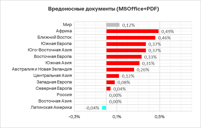 В регионах доля компьютеров АСУ, на которых угрозы были заблокированы в сетевых папках, варьирует от 0,01% в Северной Европе до 0,25% в Восточной Азии.