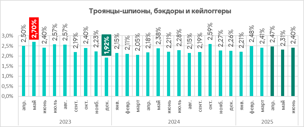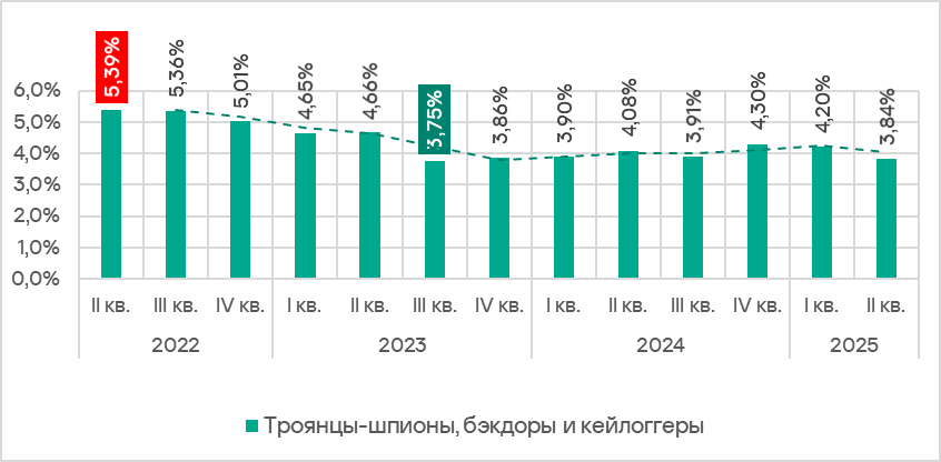 Во втором квартале 2025 года доля компьютеров АСУ, на которых было заблокировано шпионское ПО, уменьшилась по сравнению с предыдущим кварталом.