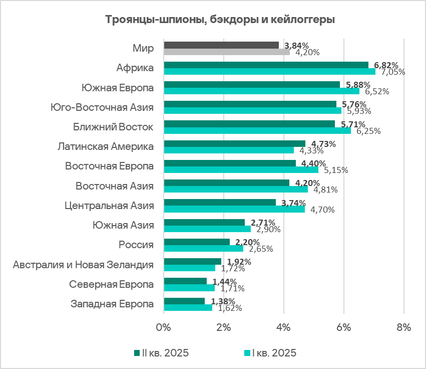 В регионах доля компьютеров АСУ, на которых было заблокировано шпионское ПО, варьирует от 1,38% в Западной Европе до 6,82% в Африке. В топ 3 регионов по этому показателю, как и в прошлом квартале, вошли Африка, Южная Европа и Юго-Восточная Азия.