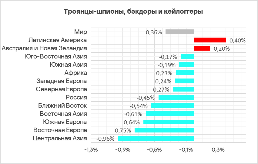 За квартал доля компьютеров АСУ, на которых были заблокированы шпионские программы, выросла в Латинской Америке, а также Австралии и Новой Зеландии.