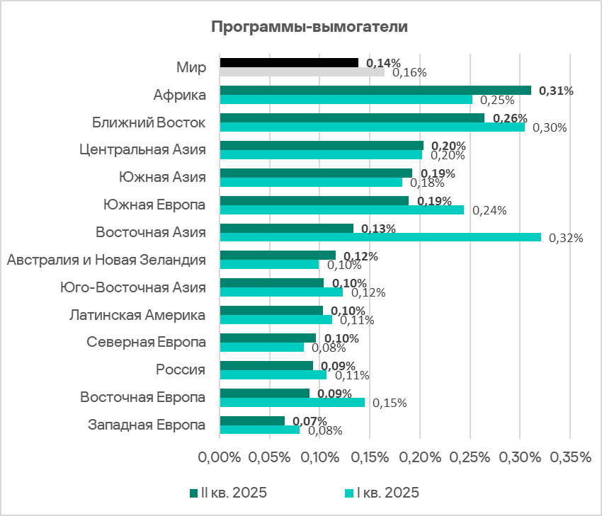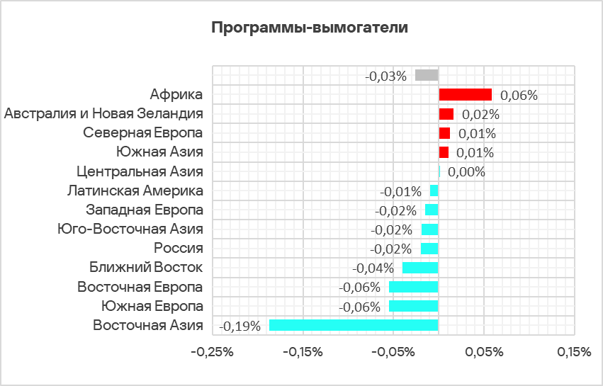 Доля компьютеров АСУ, на которых были заблокированы программы-вымогатели, в регионах варьирует от 0,07% в Западной Европе до 0,31% в Африке. В топ 3 регионов также входят Ближний Восток и Центральная Азия.