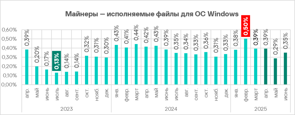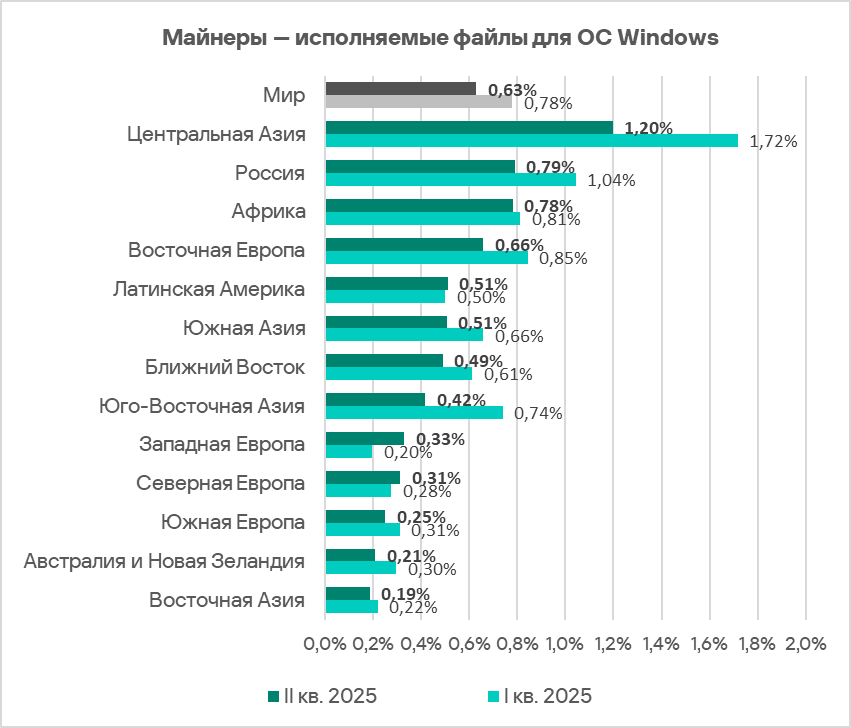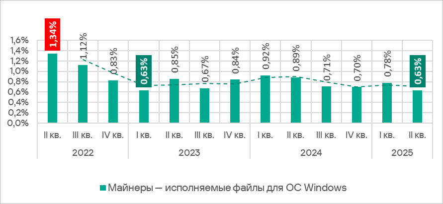 Во втором квартале 2025 года доля компьютеров АСУ, на которых были выявлены майнеры в формате исполняемых файлов для Windows, уменьшилась до 0,63%.
