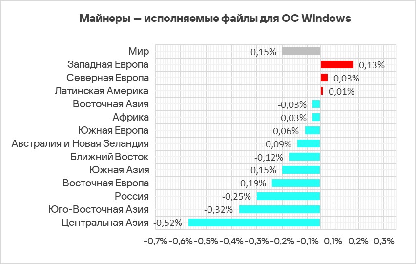 В регионах доля компьютеров АСУ, на которых были заблокированы майнеры — исполняемые файлы для ОС Windows, варьирует от 0,19% в Восточной Азии до 1,20% в Центральной Азии. Лидируют по этому показателю Центральная Азия, Россия и Африка.