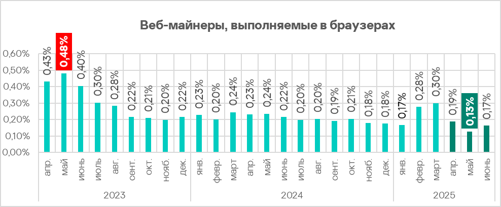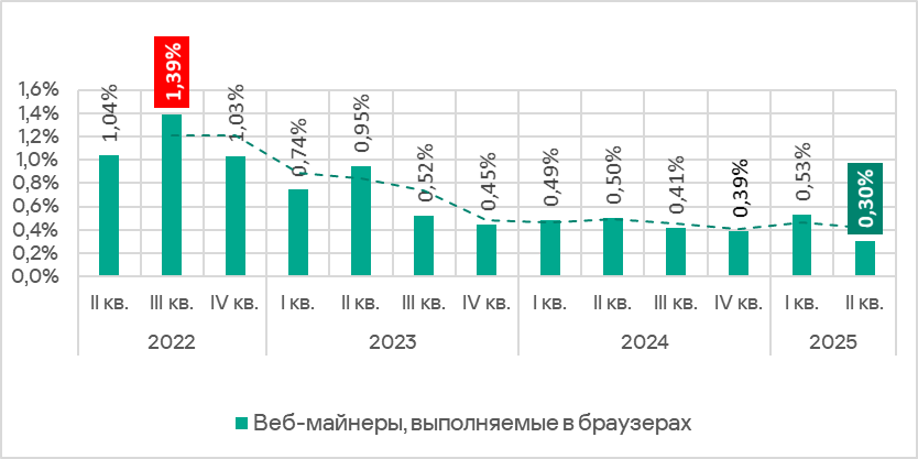 Доля компьютеров АСУ, на которых были заблокированы веб-майнеры, во втором квартале 2025 года уменьшилась до 0,30%. Это минимальное значение со второго квартала 2022 года.