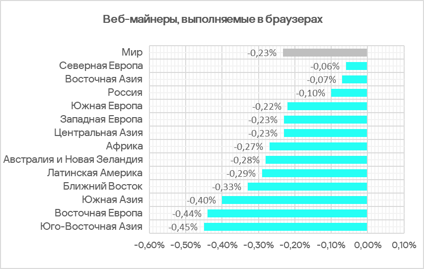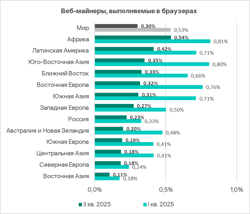 В регионах доля компьютеров АСУ, на которых были заблокированы веб-майнеры, выполняемые в браузерах, варьирует от 0,11% в Восточной Азии до 0,54% в Африке: Топ 3 регионов по этому показателю — Африка, Латинская Америка и Юго-Восточная Азия.