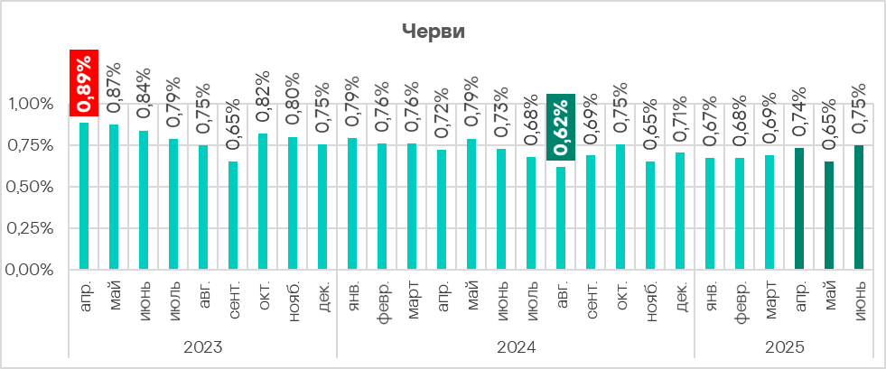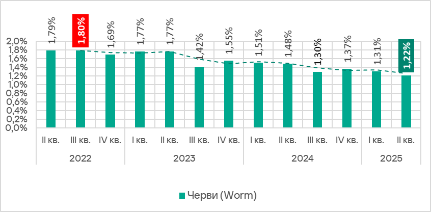 Доля компьютеров АСУ, на которых были заблокированы черви, уменьшилась во втором квартале 2025 года до 1,22%. Это минимальный показатель со второго квартала 2022 года