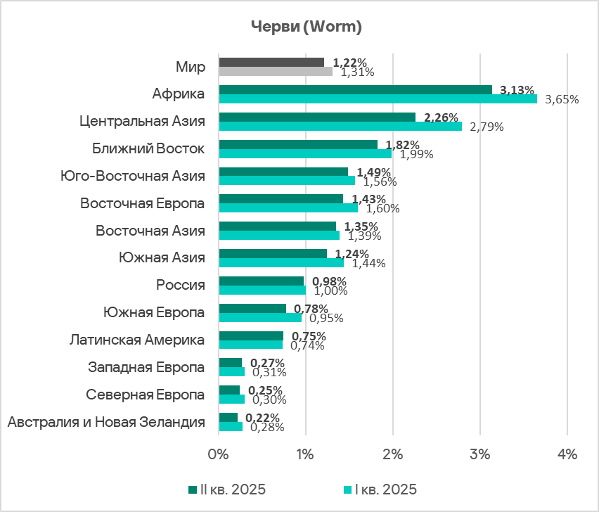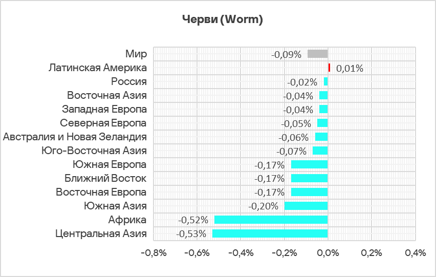 В регионах доля компьютеров АСУ, на которых были заблокированы черви, варьирует от 0,22% в Австралии и Новой Зеландии до 3,13% в Африке. Топ 3 регионов по этому показателю неизменен: Африка, Центральная Азия и Ближний Восток.