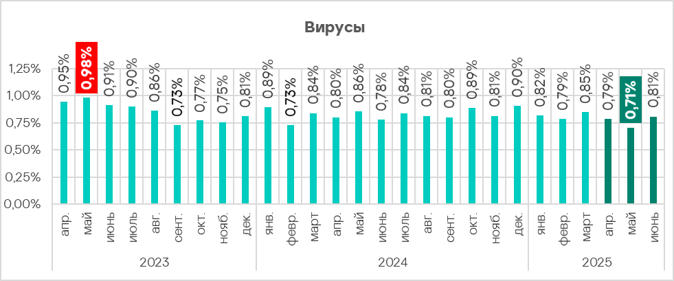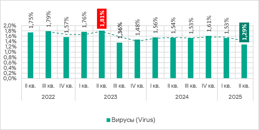 Доля компьютеров АСУ, на которых были заблокированы вирусы, во втором квартале 2025 года, как и у червей, уменьшилась до минимального со второго квартала 2022 года значения (1,29%).
