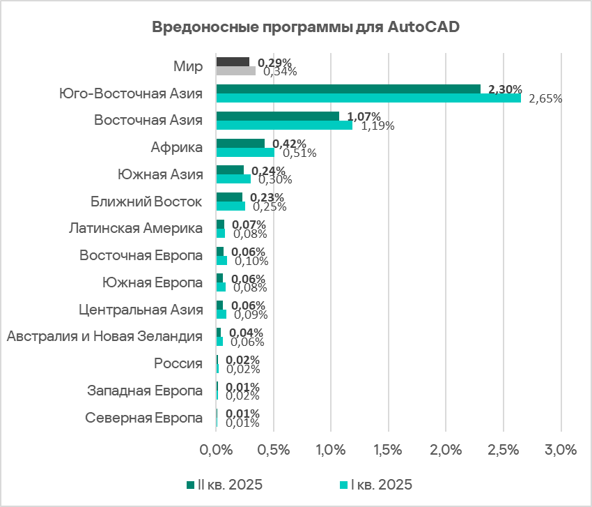 Как и в случае вирусов, показатель вредоносных программ для AutoCAD во втором квартале 2025 года уменьшился во всех регионах.