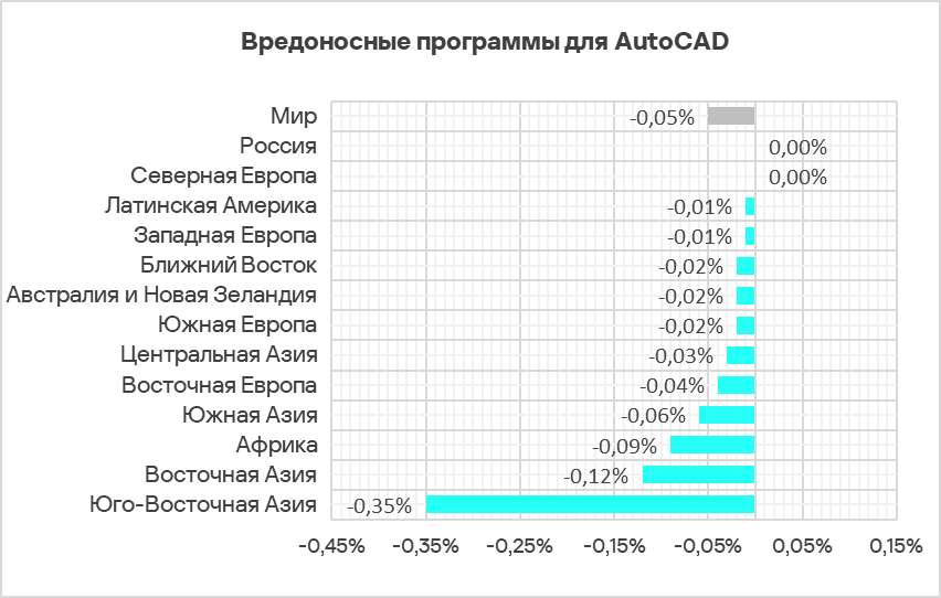 В регионах доля компьютеров АСУ, на которых были заблокированы вредоносные программы для AutoCAD, варьирует от 0,01% в Северной и Западной Европе до 2,30% в Юго-Восточной Азии. Лидируют по этому показателю те же регионы, что и в рейтинге по вирусам: Юго-Восточная Азия, Восточная Азия и Африка.