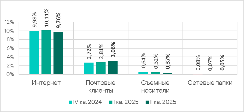 Основными источниками угроз для компьютеров в технологической инфраструктуре организаций остаются интернет (обращения к вредоносным или скомпрометированным интернет-ресурсам; вредоносный контент, распространяемый через мессенджеры; облачные сервисы хранения и обработки данных и CDN), почтовые клиенты (фишинговые рассылки) и съемные носители.