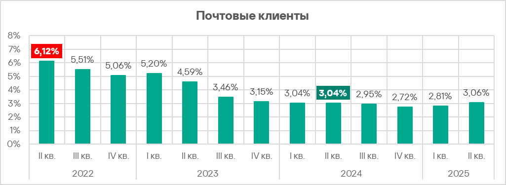Во втором квартале 2025 года продолжила расти доля компьютеров АСУ, на которых в течение квартала были заблокированы угрозы, распространяемые через почту. Этот показатель за квартал вырос во всех регионах, кроме России.