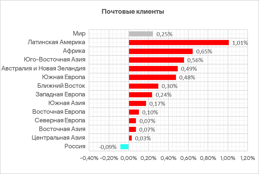 Топ 3 регионов по уровню угроз из почтовых клиентов: Южная Европа, Латинская Америка и Ближний Восток.