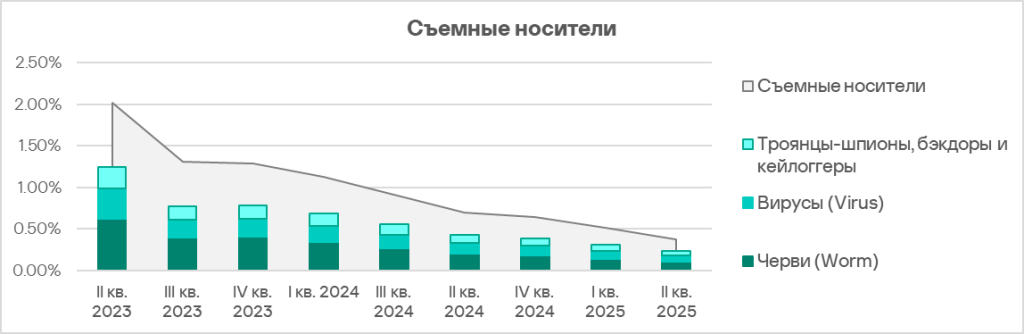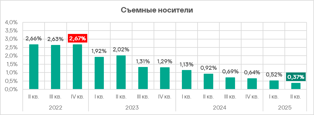 Доля компьютеров АСУ, на которых были заблокированы угрозы на съемных носителях, II квартал 2022 года — II квартал 2025 года