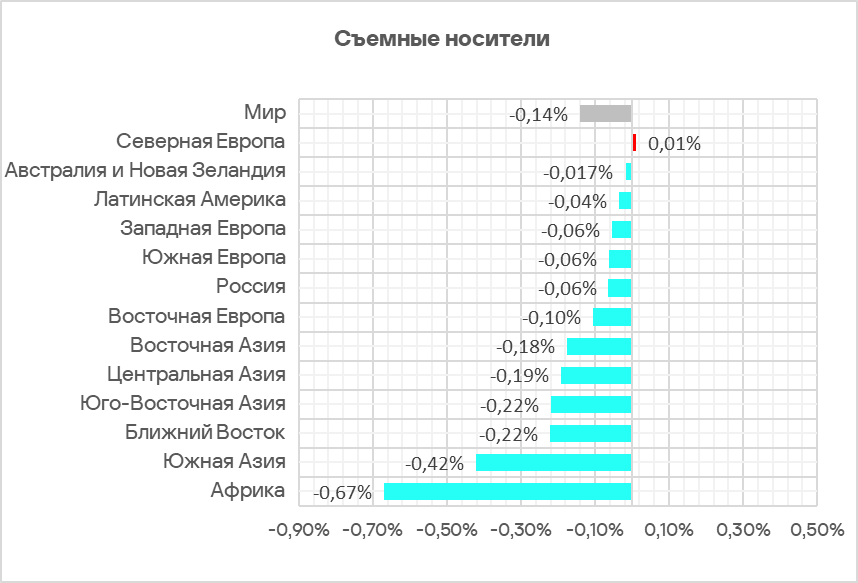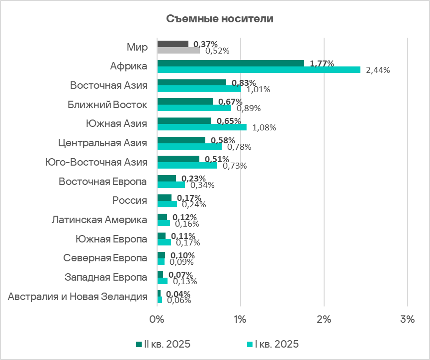 Во втором квартале 2025 показатель угроз со съемных носителей уменьшился во всех регионах, кроме Северной Европы.