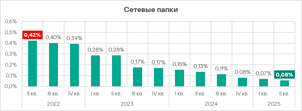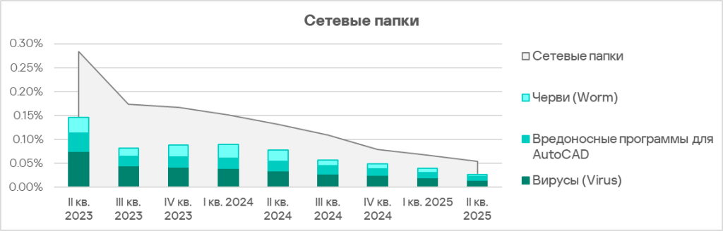 Показатели по сетевым папкам достигли минимальных значений в период со второго квартала 2022 года. Это минорный источник угроз, однако не стоит его недооценивать — через сетевые папки распространяются черви, вирусы и вредоносное ПО для AutoCAD.
