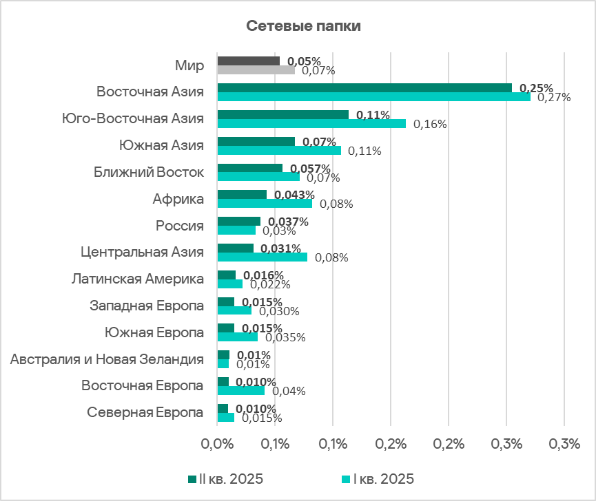 Во втором квартале 2025 показатель угроз в сетевых папках уменьшился во всех регионах, кроме России и Австралии и Новой Зеландии.