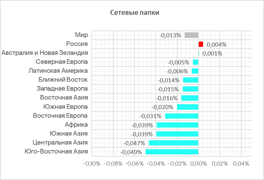 В регионах доля компьютеров АСУ, на которых угрозы были заблокированы в сетевых папках, варьирует от 0,01% в Северной Европе до 0,25% в Восточной Азии.