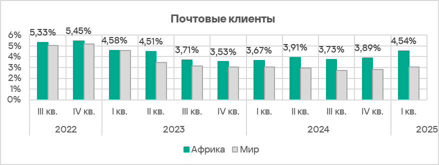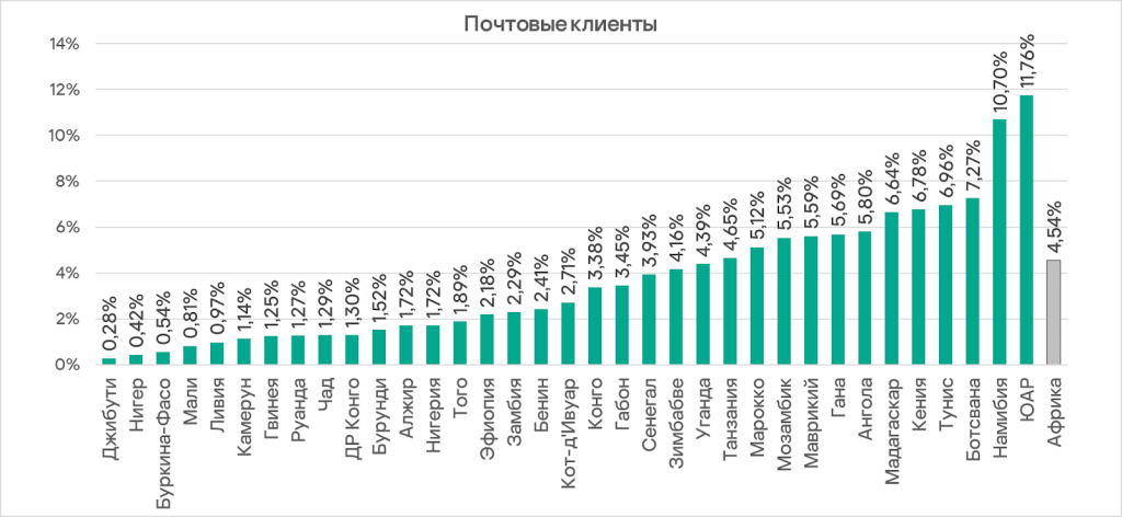 Почтовые клиенты — единственный источник угроз в регионе, показатель которого вот уже более года демонстрирует тенденцию к росту. В рейтинге регионов по доле компьютеров АСУ, на которых угрозы были заблокированы в почтовых клиентах, Африка находится на четвертом месте с 4,54%. Это в 5,7 раз больше, чем в России с минимальным показателем среди регионов.