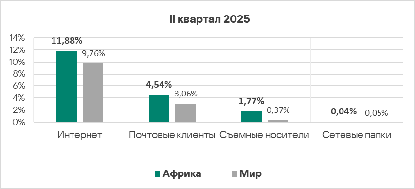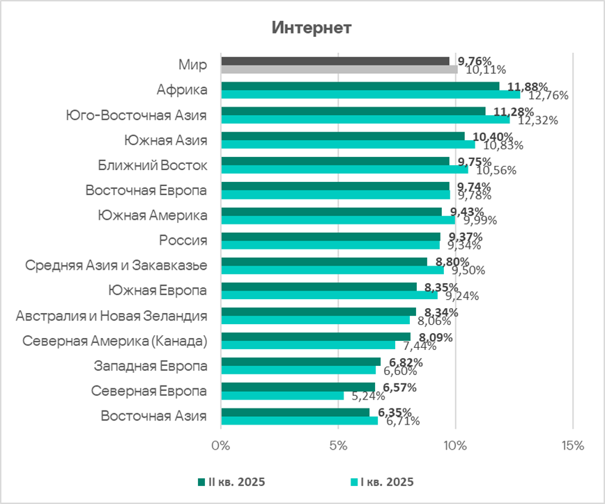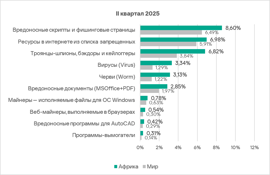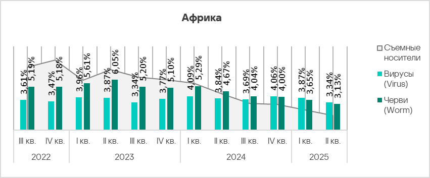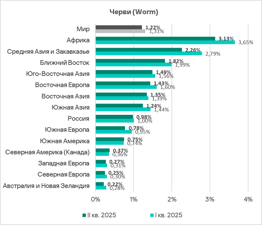 Африка — многолетний лидер среди регионов по доле компьютеров АСУ, на которых блокируются черви. Показатель в Африке во втором квартале 2025 года (3,13%) в 14,2 раза превышает долю в регионе Австралия и Новая Зеландия, который замыкает соответствующий рейтинг.