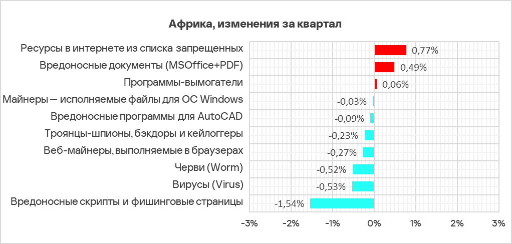 В Африке у всех категорий угроз доля компьютеров АСУ, на которых были заблокированы вредоносные объекты, выше среднемирового значения. Африка лидирует среди регионов по показателям следующих категорий угроз: ресурсы в интернете из списка запрещенных, веб-майнеры, шпионские программы, программы-вымогатели, черви.