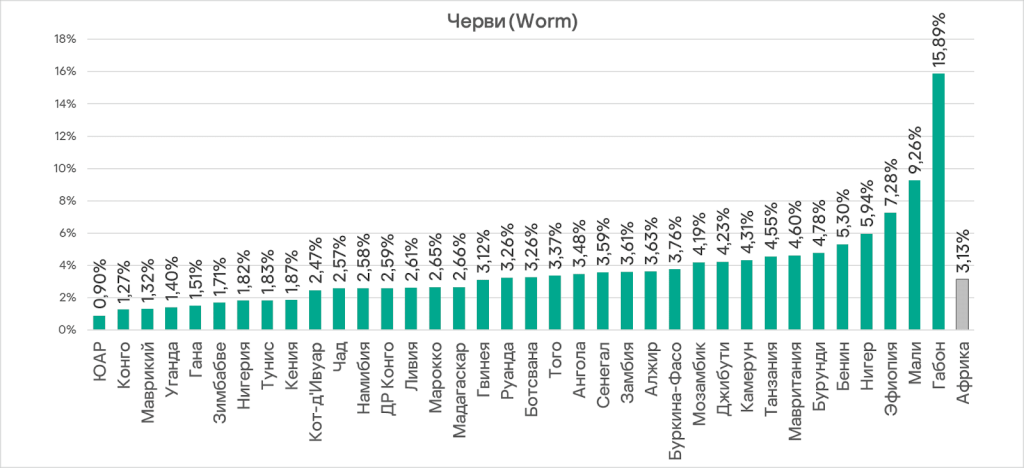 В странах региона по доле компьютеров АСУ, на которых блокируются черви, с большим отрывом лидирует Габон с аномально высокими 15,89%. Это в 1,7 раз больше значения следующей страны в рейтинге — Мали (9,26%) и в 17,7 раз — показателя ЮАР (0,90%), которая замыкает рейтинг.