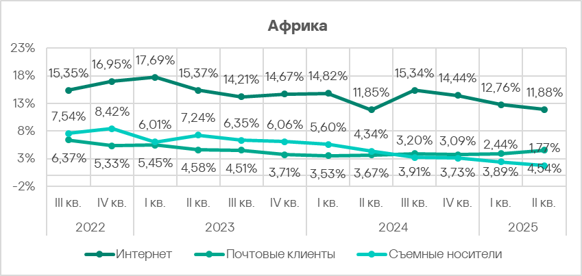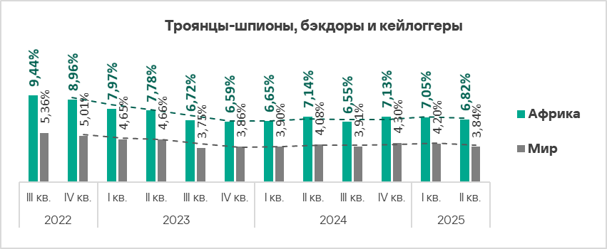Еще одна постоянная беда региона — шпионские программы. Африка устойчиво лидирует среди регионов по доле компьютеров АСУ, на которых были заблокированы программы-шпионы. Во втором квартале 2025 года показатель в Африке уменьшился до 6,82%, однако это в 4,9 раза больше, чем в Западной Европе, где это значение наименьшее.