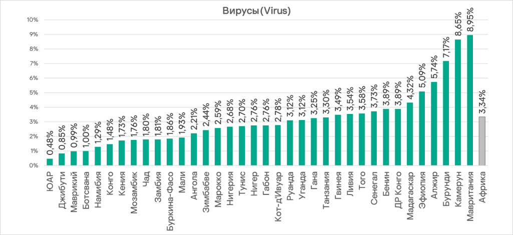 Среди стран региона по доле компьютеров АСУ, на которых блокируются вирусы, лидируют Мавритания, Камерун и Бурунди. Как и в случае с червями, разброс значений в странах довольно большой: показатель Мавритании (максимальные 8,95%) превышает показатель ЮАР (минимальные 0,48%) в 18,6 раза.