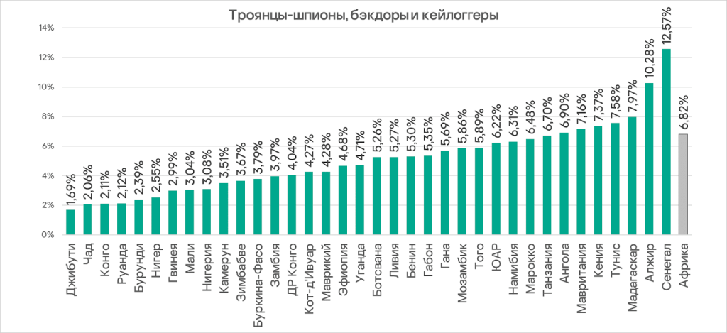 По доле компьютеров АСУ, на которых блокируется шпионское ПО, Африка неизменно лидирует в соответствующем рейтинге регионов.