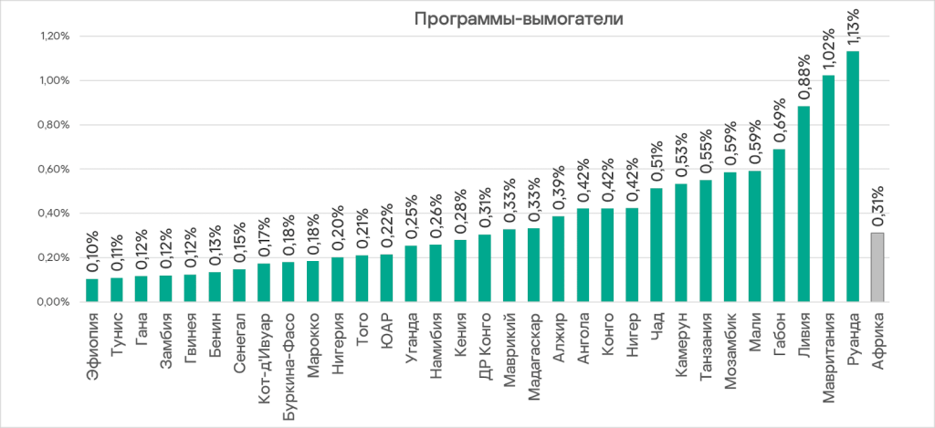 Среди стран региона в тройке лидеров по доле компьютеров АСУ, на которых были заблокированы программы-вымогатели: Руанда, Мавритания, Ливия. На четвертом месте — Габон.