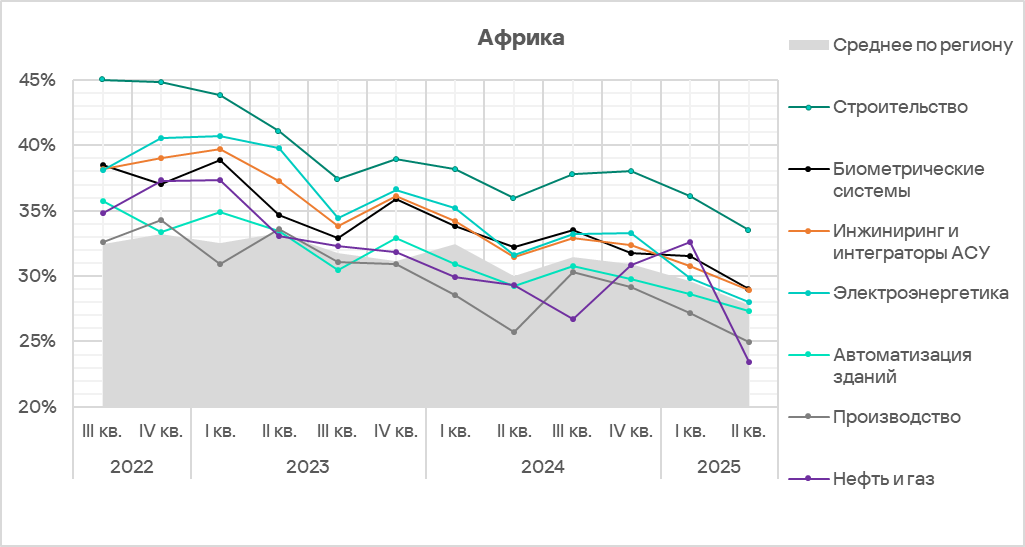 Показатели категорий  угроз в отраслях в Африке, II квартал 2025 года