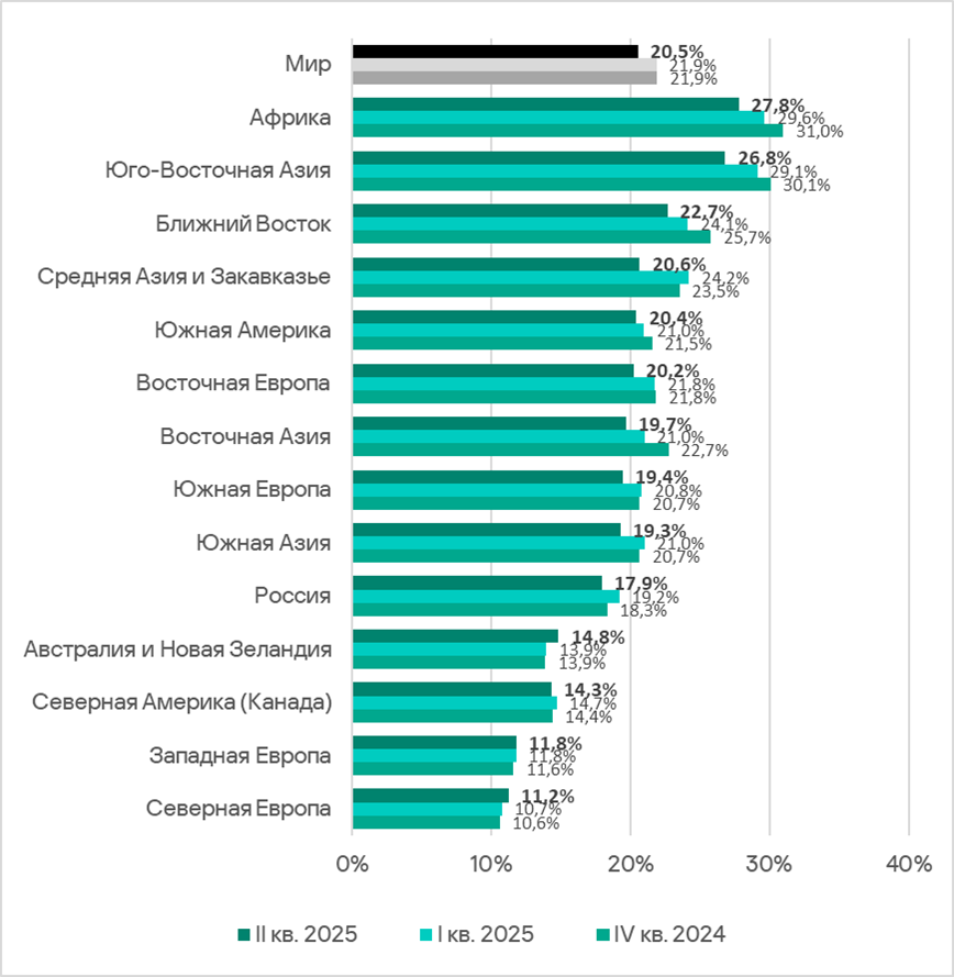 Среди регионов во втором квартале 2025 года Африка лидирует в рейтингах по доле компьютеров АСУ, на которых были заблокированы: