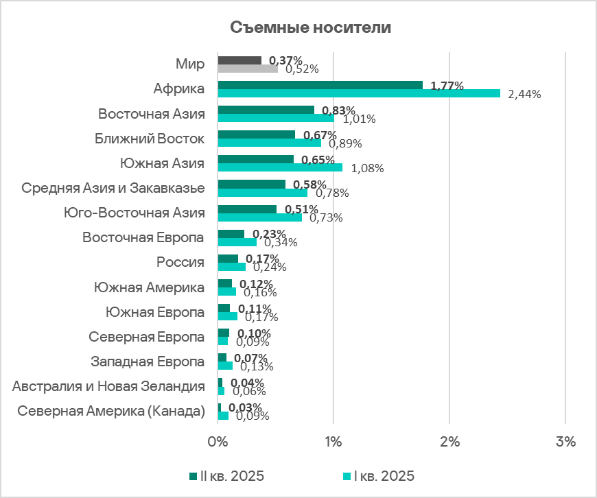 Доля компьютеров АСУ, на которых угрозы были заблокированы при подключении съемных носителей, в регионе во втором квартале 2025 года превышает аналогичный среднемировой показатель в 4,8 раза. По этому показателю Африка с большим отрывом лидирует среди регионов.