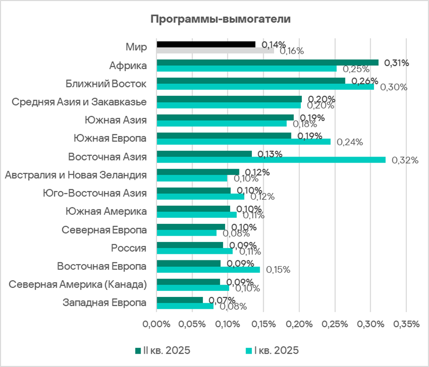 Африка занимает первое место среди регионов по росту доли компьютеров АСУ, на которых были заблокированы программы-вымогатели. В результате во втором квартале 2025 года регион возглавил рейтинг с показателем 0,31%. Это в 4,8 раза больше доли региона с минимальным значением — Западной Европы.
