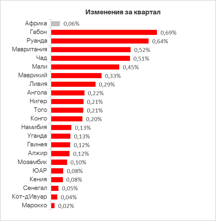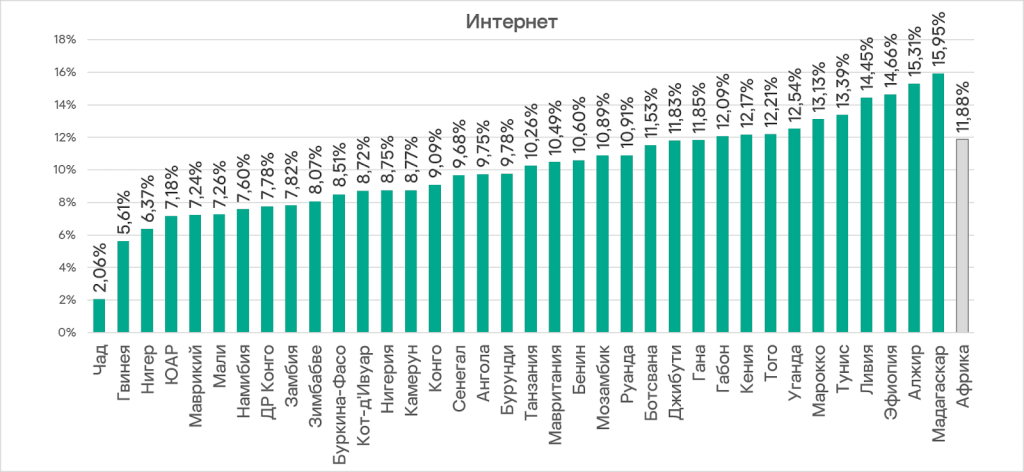 Среди стран региона нет ярко выраженного лидера по этому показателю, зато заметно меньше, чем в остальных странах, доля компьютеров АСУ, на которых были заблокированы угрозы из интернета, в Чаде (2,06%). Максимальный показатель на Мадагаскаре — 15,95%.