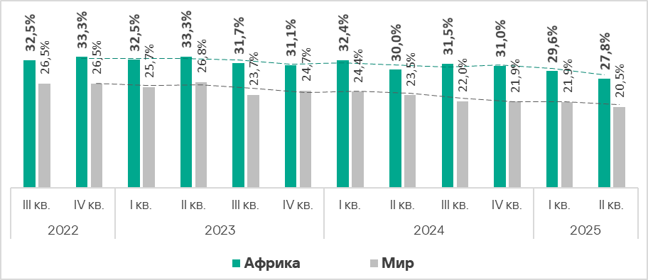 Во втором квартале 2025 года доля компьютеров АСУ, на которых были заблокированы вредоносные объекты, в Африке снизилась до 27,8%. Показатель в регионе снижается третий квартал подряд.