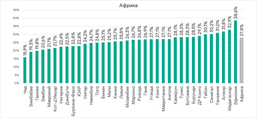 В странах региона доля компьютеров АСУ, на которых были заблокированы вредоносные объекты, варьирует от 15,9% в Чаде до 38,6% в Эфиопии.