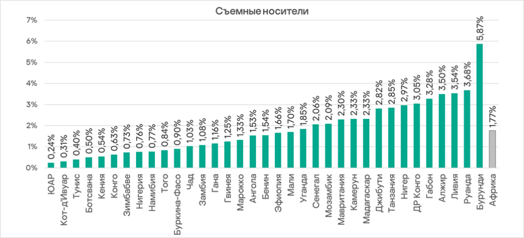 Среди стран региона по доле компьютеров АСУ, на которых были заблокированы угрозы при подключении съемных носителей, с заметным отрывом лидирует Бурунди с 5,8%. Показатели остальных стран варьируют от 0,24% в ЮАР до 3,68% в Руанде.
