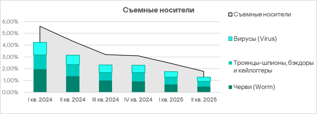 Показатель червей, как и доля угроз со съемных носителей в целом, постепенно снижается. У вирусов более сложная динамика, однако в последние два квартала мы также отмечаем снижение.