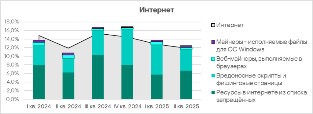 Основные категории угроз из интернета, блокируемые на компьютерах АСУ, — это интернет-ресурсы из списка запрещенных, вредоносные скрипты и фишинговые страницы и майнеры.
