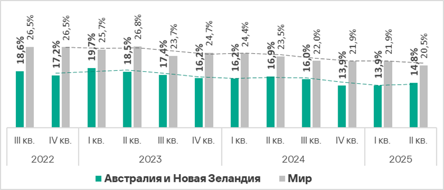 Показатель в регионе растет третий квартал подряд, и по его росту во втором квартале 2025 года Австралия и Новая Зеландия занимают второе место в мире.