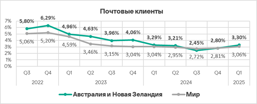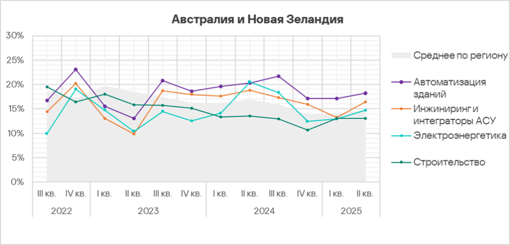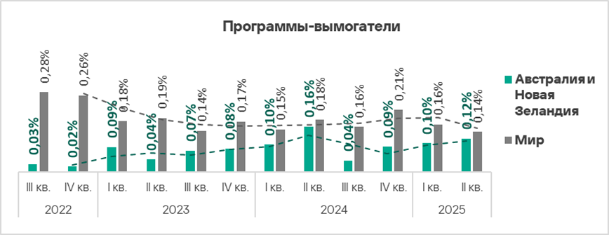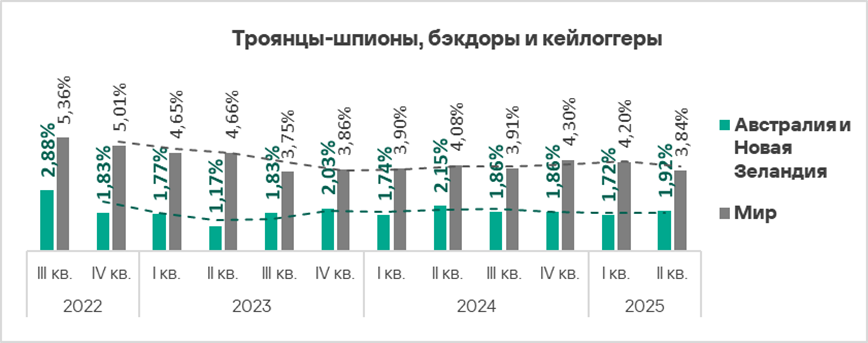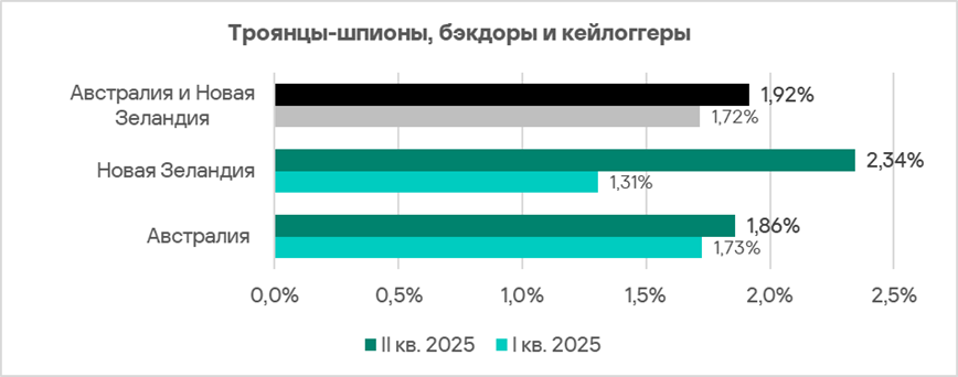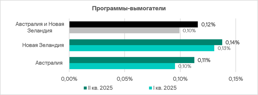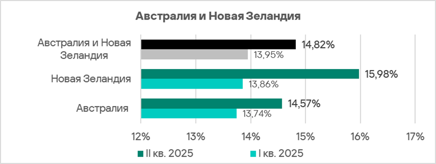 Доля компьютеров АСУ, на которых блокируются шпионские программы, в регионе колеблется. Австралия и Новая Зеландия — один из двух регионов, где этот показатель во втором квартале 2025 года вырос.