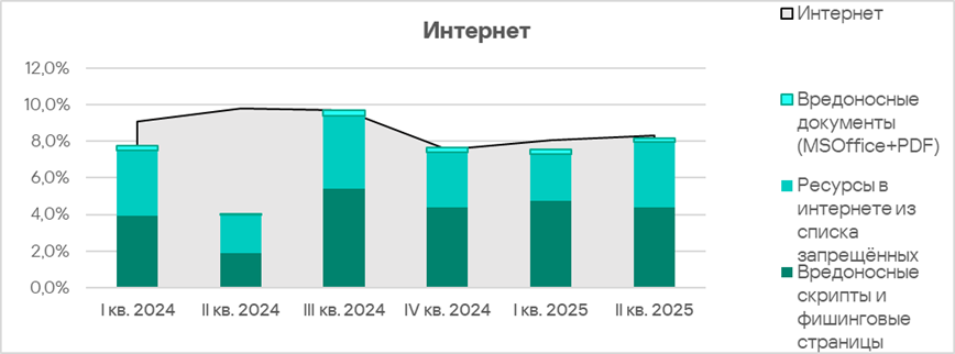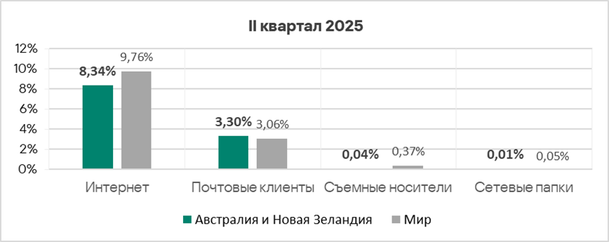 Во втором квартале 2025 года из всех источников угроз доля компьютеров АСУ, на которых были заблокированы вредоносные объекты, увеличилась у интернета и почтовых клиентов. По росту показателя угроз из интернета Австралия и Новая Зеландия находятся на втором месте среди регионов.