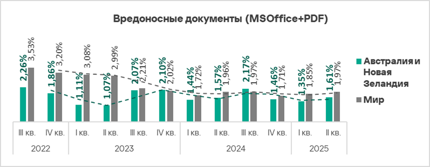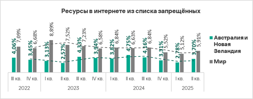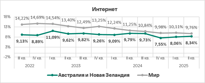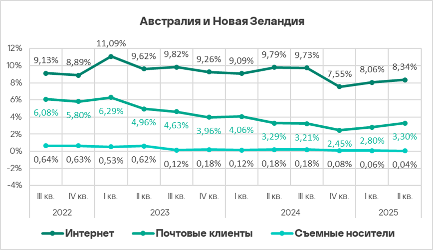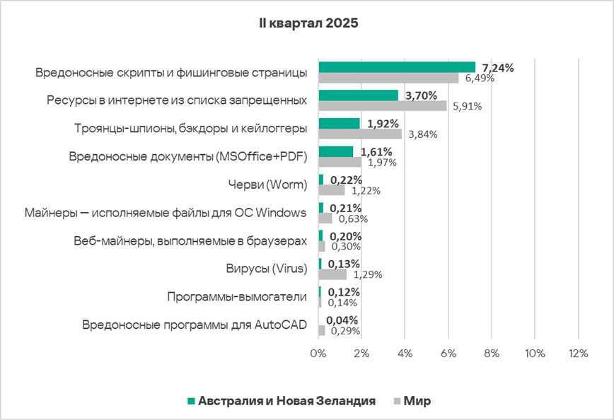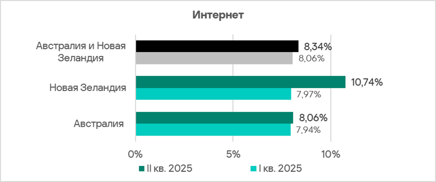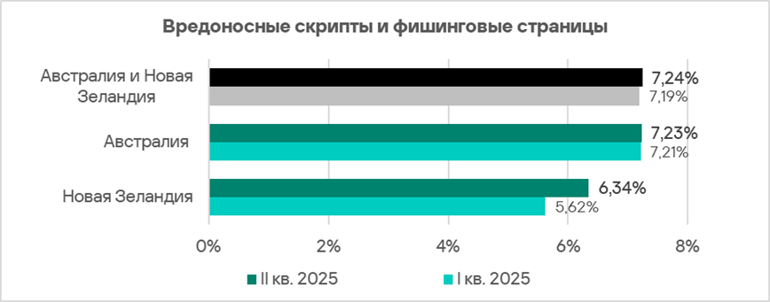 Во втором квартале 2025 года Австралия и Новая Зеландия — один из двух регионов, где доля компьютеров АСУ, на которых блокируются вредоносные скрипты и фишинговые страницы, не уменьшилась.