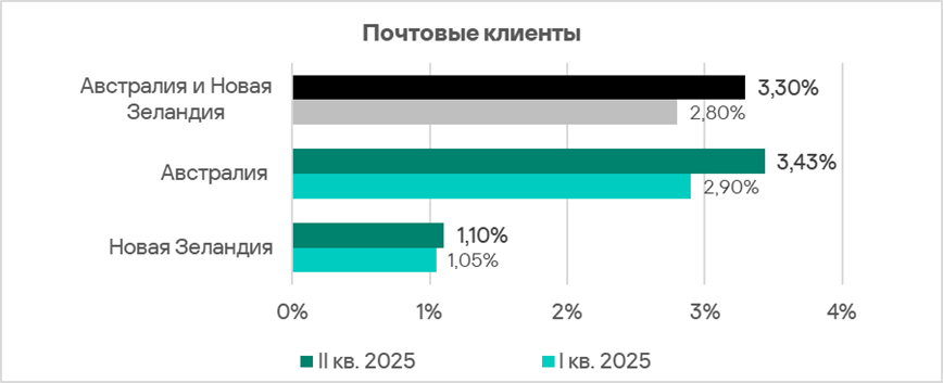 По доле компьютеров АСУ, на которых были заблокированы угрозы в почтовых клиентах, во втором квартале 2025 года Австралия и Новая Зеландия занимают седьмое место с показателем 3,30%. Это в 4,1 раза больше, чем в России, которая замыкает соответствующий рейтинг.
