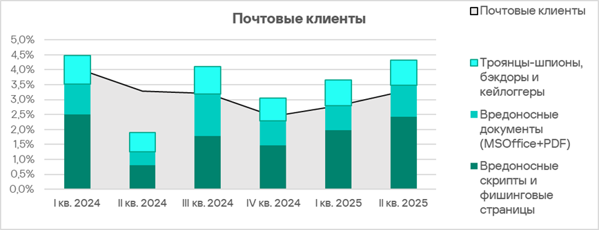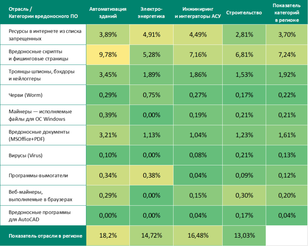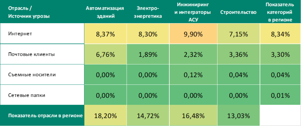 Относительно высокие показатели угроз, распространяющихся через почтовые клиенты (фишинг), а также вредоносных скриптов могут быть признаками доступности технологических систем в регионе для продвинутых категорий злоумышленников.