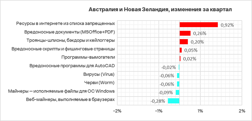 Также это один из двух регионов, где за квартал вырос показатель шпионских программ. Австралия и Новая Зеландия занимает второе место по росту за квартал доли компьютеров АСУ, на которых блокируются программы-вымогатели. Этот показатель в регионе растет третий квартал подряд.